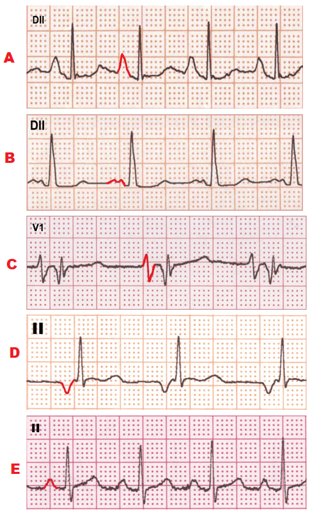 In a rhythm strip E, presents Normal P wave that suggests normal sinus rhythm.